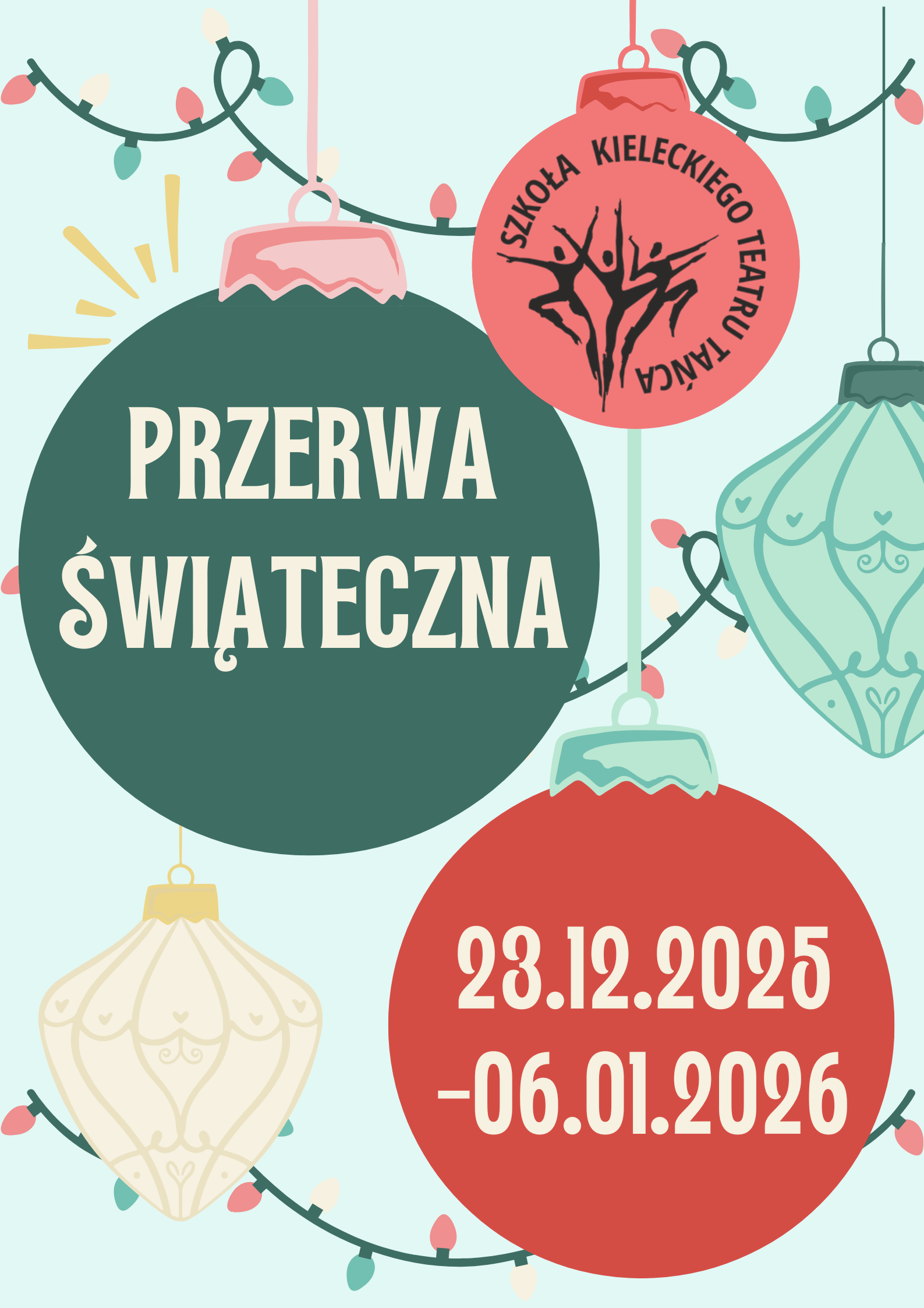 Szkoła Tańca Szkoła Tańca 17 grudnia 2025 Informujemy, że przerwa świąteczna w Szkole Kieleckiego Teatru Tańca trwa od 23.12.2025 r. do 06.01.2026 r. Galeria