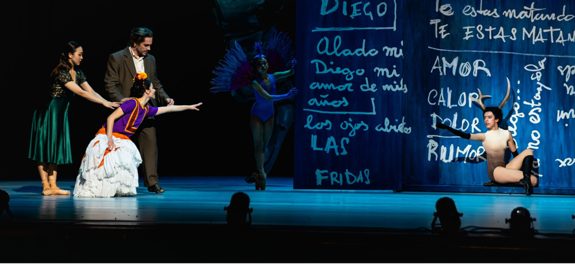 Annabelle Lopez Ochoa bardzo poważnie traktuje swoje spektakle, a z wrocławskimi tancerzami przez trzy tygodnie sama prowadziła próby, choć przedstawienie jest rekonstrukcją istniejącej już od kilku lat choreografii. Artyści baletu nie mieli łatwego zadania. By wydobyć piękno i harmonię ważny był nie tylko taniec, ale też gra aktorska, precyzyjny ruch sceniczny i współpraca zespołowa. W całym spektaklu ruch jest bardzo prosty, bez spektakularnych obrotów i skoków. Jedynie w duetach głównych bohaterów choreografka wprowadza trudniejsze technicznie podnoszenia i partnerowania. Postacie realistyczne zostały ograniczone do dwójki głównych bohaterów: Fridy Kahlo i Diega Riviery. W premierowym spektaklu w partii tytułowej została obsadzona młodziutka, debiutująca na wrocławskiej scenie, pochodząca z Sycylii Carola Minardo. Artystka idealnie odczuwa intencje choreograficzne Annabelle Lopez Ochoi. Jest niewinna, ale też przepełniona cierpieniem i ulotną radością chwil. Z kolei Daniel Agudo Gallardo jako Diego Riviera, namiętny kochanek, ale i egoistycznie zapatrzony w siebie artysta nie przekonał mnie. Specjalny kostium powiększający jego sylwetkę i zmieniający sposób poruszania miał pokazywać jego pozorną ociężałość, ale także zalotność. Tancerz z przyklejonym uśmiechem nie kontrastuje roli, nie emanuje latynoskim macho, czymś co charakteryzowało meksykańskich męż-czyzn epoki Diega. Obok głównych bohaterów, brawurową rolę w przedstawieniu stworzyła niezwykle smukła i wysoka, o wdzięku łani – Laura Flügel (jako Jeleń). W rolę Ptaka mistrzowsko wcieliła się Miho Okamuro, szczególnie w finałowej scenie – kiedy Frida amienia się w motyla, a jej dusza ulatuje do nieba w postaci ptaka, artystka stojąc na czarnym sześcianie, desperacko próbuje wznieść się w powietrze aż do opadnięcia kurtyny. Niezwykle piękna, ale i wzruszająca scena.